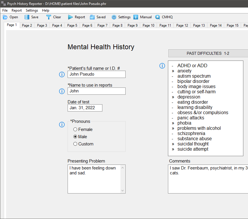 Your patient completes the paper-based Comprehensive Mental Health Questionnaire™ (CMHQ™), the data-collection instrument of Psych History Reporter™. Entering their responses into the software yields an editable 3-to-6-page narrative report that opens in Microsoft Word™ or Google Docs™.